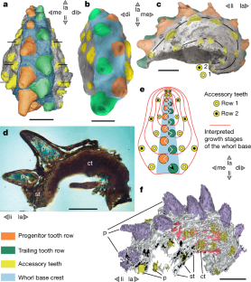 研究團隊勘察了“貴州石阡化石庫”,發(fā)掘出代表最古老的、有頜類牙齒的雙列黔齒魚(Qianodus duplicis)齒旋,將牙齒最早化石證據(jù)提前了 1400 萬年(“ The oldest gnathostome teeth ”.nature);此外,她們發(fā)現(xiàn)新塑梵凈山魚(Fanjingshania renovata)的棘刺表明,在志留紀早期,原始軟骨魚類已經(jīng)演化出典型的柵棘魚形態(tài),兼具硬骨魚類的組織學(xué)特征,是毫無爭議的最早有頜動物,這也將棘魚類的出現(xiàn)向前推了 1500 萬年(“Spiny chondrichthyan from the lower Silurian of South China”.nature)。